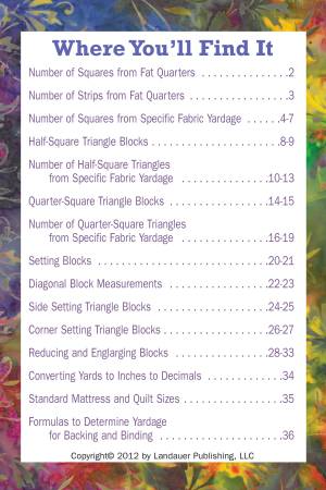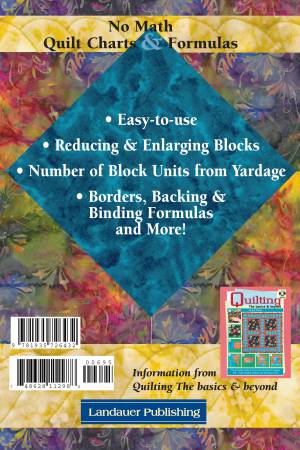Simplify your quilting math with Updated No Math Quilt Charts & Formulas. This pocket-sized reference guide puts 16 quilting charts and easy-to-use formulas right at your fingertips—no complicated calculations needed! Learn standard bed quilt sizes, how to resize patchwork blocks, and quickly calculate fabric requirements for blocks, strips, and triangles. You’ll also find handy formulas for quilt backing and binding, plus guides for diagonal blocks, side-setting, and corner triangles. Compact and portable, it’s the perfect carry-along reference for planning your next quilt project.